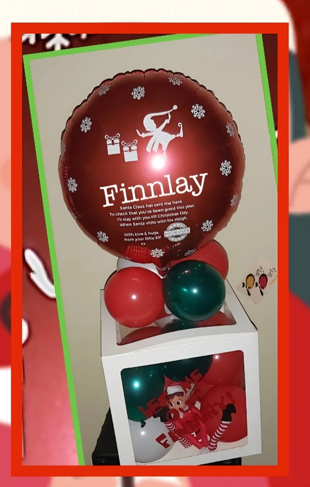 Each box contains an elf, mini balloons, and a selection of sweet treats, and is topped off with a personalised foil balloon.